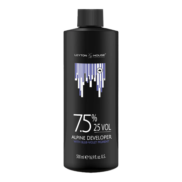 Leyton House Developer 1000ml features a stabilised, creamy formula designed to deliver consistent lift, smooth blending, and precise tonal accuracy when used with Leyton House permanent and demi‑permanent colour systems; its conditioning base supports hair softness and shine throughout processing, while the controlled viscosity ensures even saturation and predictable results across all levels, making it a reliable choice for professional colourists working with 3%, 6%, 9%, or 12% strengths depending on the desired lift, deposit, or grey coverage. Exclusive Alpine Developers 4.5% (15vol) and 7.5% (25vol) contain a unique blue‑violet pigment that boosts toning performance during lightening, helping to counteract unwanted warm undertones and refine the final result.